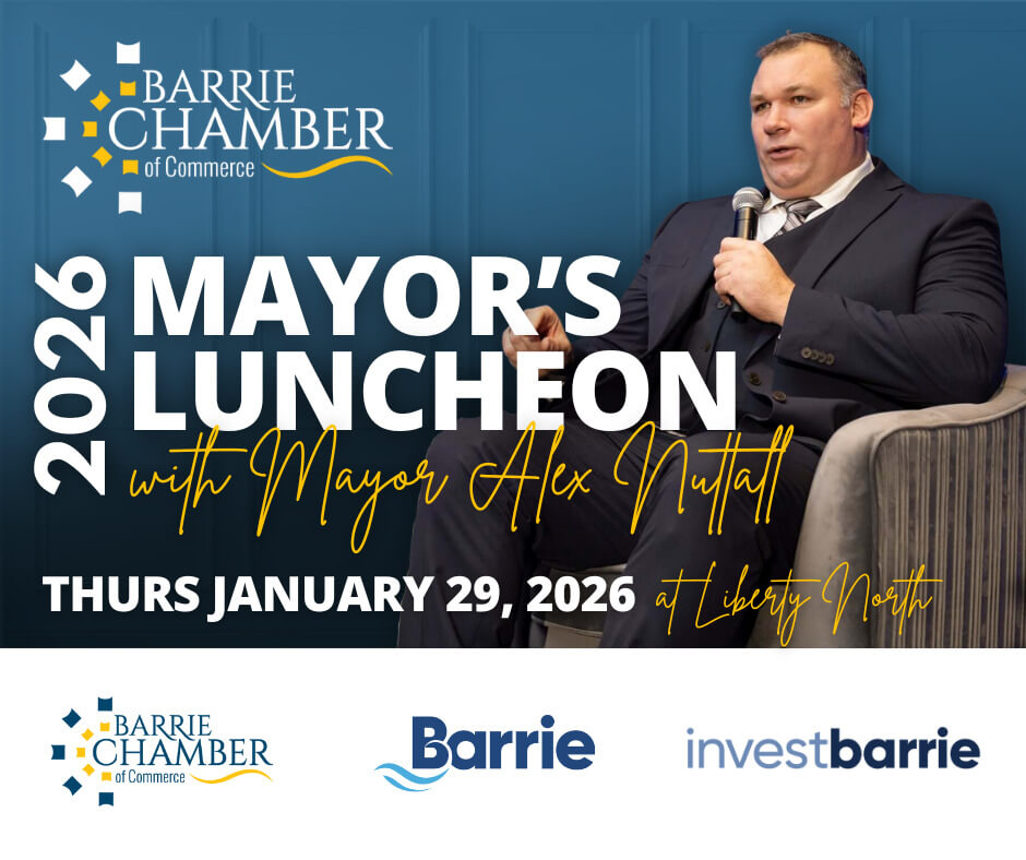 The Barrie Chamber of Commerce, in partnership with the City of Barrie and Invest Barrie, are pleased to announce the return of the Annual Mayor's Update Luncheon on Thursday, January 29, 2026. Join us with His Worship Mayor Alex Nuttall, for an update to Chamber members and area business community members on the City's continued progress and next steps for building on Barrie's community assets. We sincerely hope you will join us for this opportunity to learn about Barrie's economy, now and in the future, including the role of local business. Question and Answer session included.