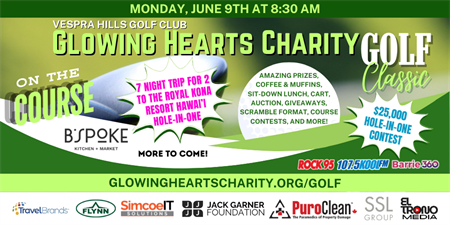 Glowing Hearts Charity would love for you to participate in our Glowing Hearts Charity 2025 Golf Classic on Monday, June 9th at 8:30am at Vespra Hills Golf Club (a ClubLink course). REGISTRATION CLOSES ON JUNE 2ND.