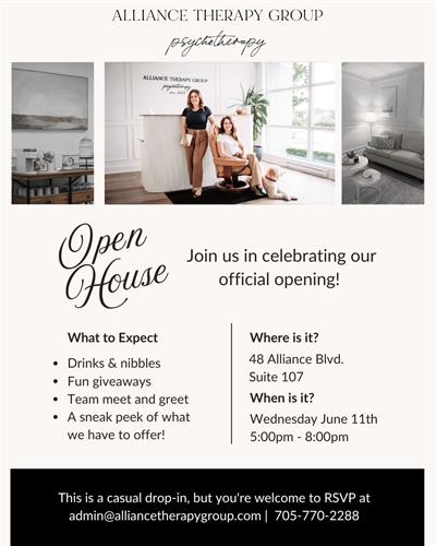 This is a casual, drop-in event, but if you’d like more information, feel free to reach out to us at admin@alliancetherapygroup.com or call us at 705-770-2288.