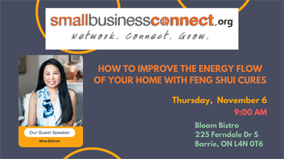 Our featured speaker, Nina Doiron, will share “How to Improve the Energy Flow of Your Home with Feng Shui Cures.” Learn how simple changes in your environment can create harmony, attract abundance, and help you feel more balanced both at home and in business.